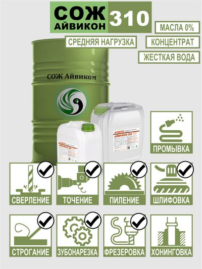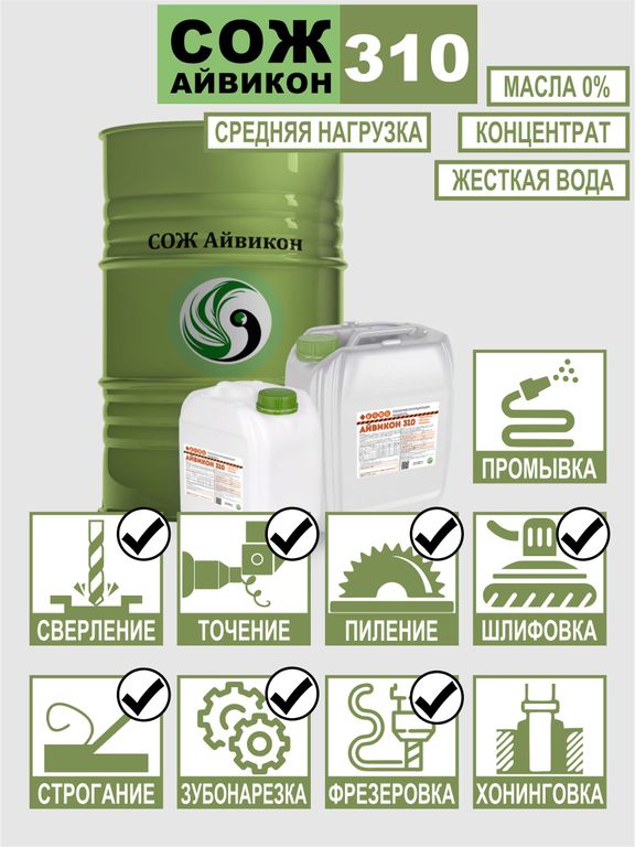 Айвикон 310 – это высококачественный синтетический концентрат водосмешиваемой смазочно-охлаждающей жидкости, предназначенный для использования в металлообработке. Продукт идеально подходит для малонагруженных и средненагруженных операций, таких как шлифование, токарная обработка, пиление, термическая резка и другие процессы обработки сталей и чугунов.